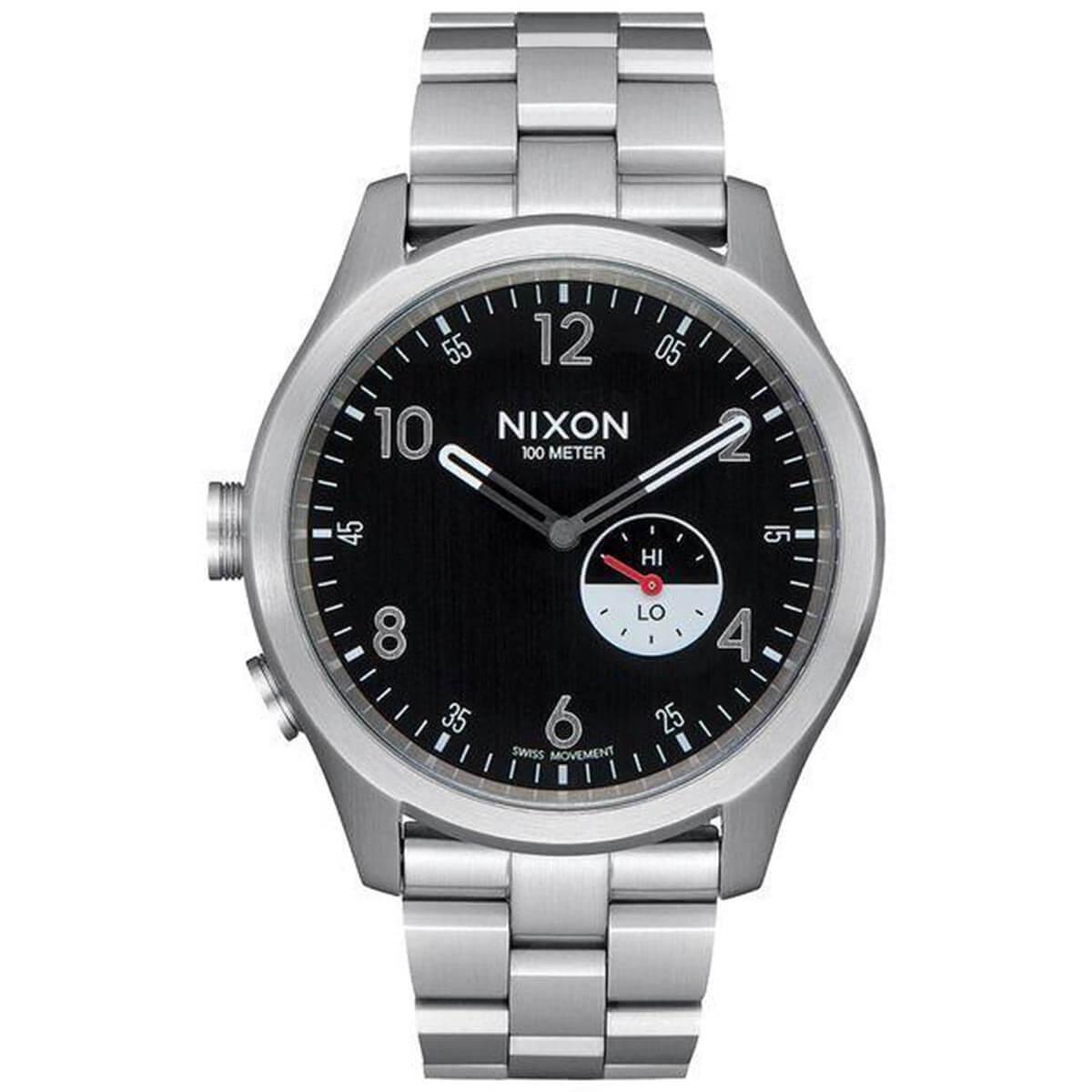 Nixon A1168000 men’s Beacon quartz black dial bracelet lefty watch is offered, in a polished solid stainless steel case. This model is made in dimensions of 41mm across and 9mm high. This watch has a fixed bezel and a textured push/pull main crown with function pushers. Nixon A1168000 is fitted with a silver stainless steel bracelet. Securing the bracelet is a fold over push button clasp made in stainless steel.