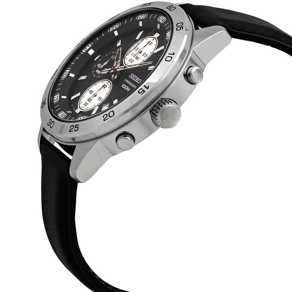 Seiko SKS649P1 men’s chronograph black dial leather strap watch is offered, in a polished solid stainless steel case. This model is made in dimensions of 44mm across and 12mm high. This watch has a fixed black accented silver tone bezel and a textured push/pull main crown with function pushers. Seiko SKS649P1 is equipped with a stitched black genuine leather strap. Securing the strap is a pin buckle clasp made in stainless steel.